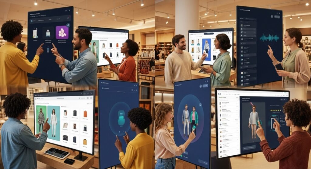 Futuristic retail store with data visualizations flowing across screens, representing AI analytics.